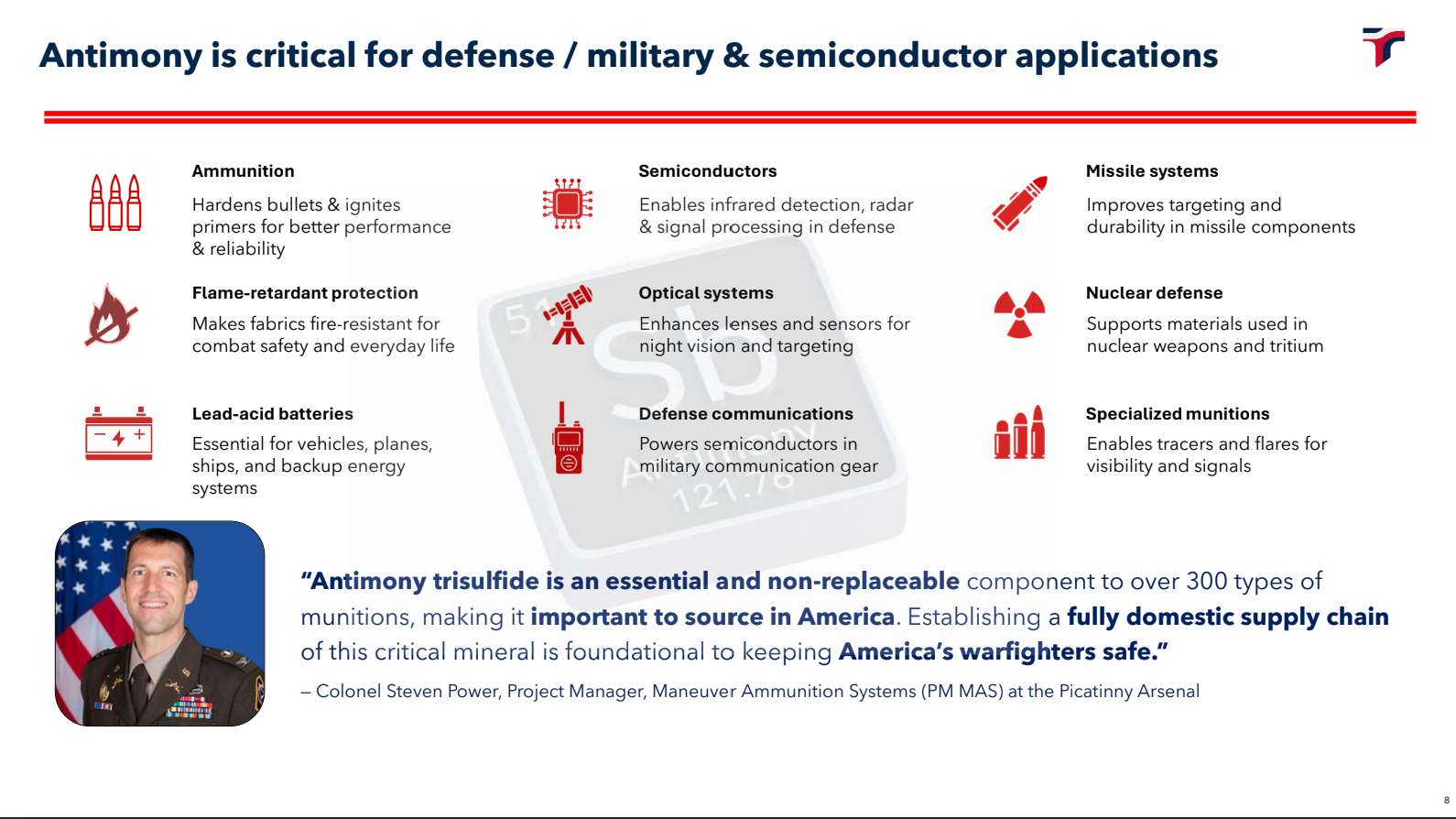 What is antimony used for in Trump’s defense buildup? Everything that matters. Antimony is essential for over 80,000 parts across 1,900 weapon systems. Every night-vision goggle, every armor-piercing round, every flame-retardant system relies on antimony in some form. As Trump ramps up defense spending with that new $150 billion mandatory funding stream for the Pentagon, antimony demand is about to go ballistic.
