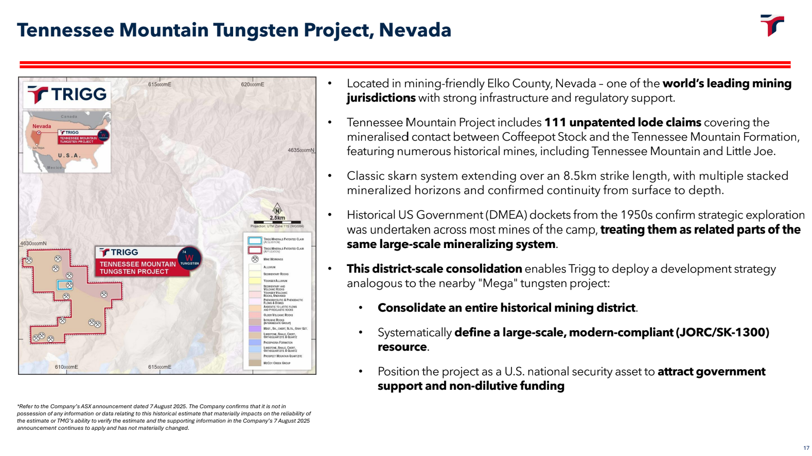 This publication may include forward-looking statements that involve substantial risks and uncertainties. These statements reflect current expectations but are subject to factors that may cause actual results to differ materially, including operational challenges, regulatory developments, market volatility, financing risks, geopolitical events, commodity price fluctuations, and other uncertainties. Neither Trigg Minerals Limited nor Black Swan undertakes any obligation to update or revise forward-looking statements.